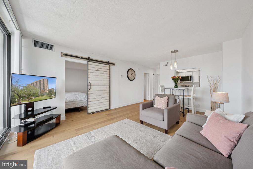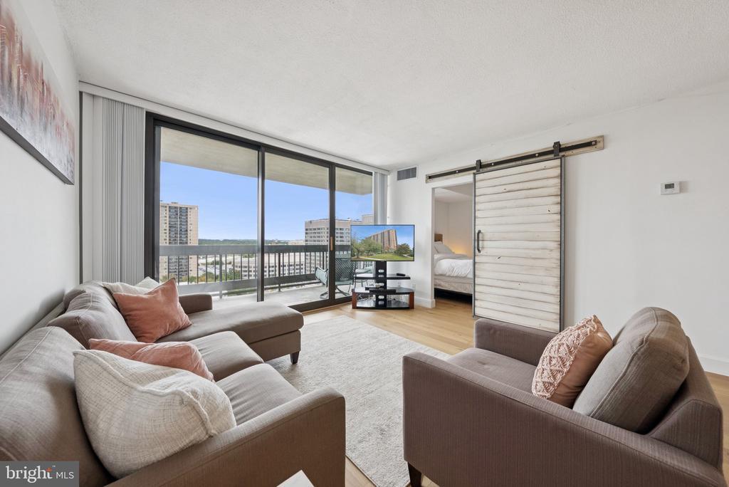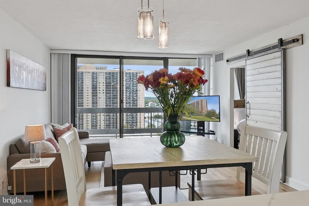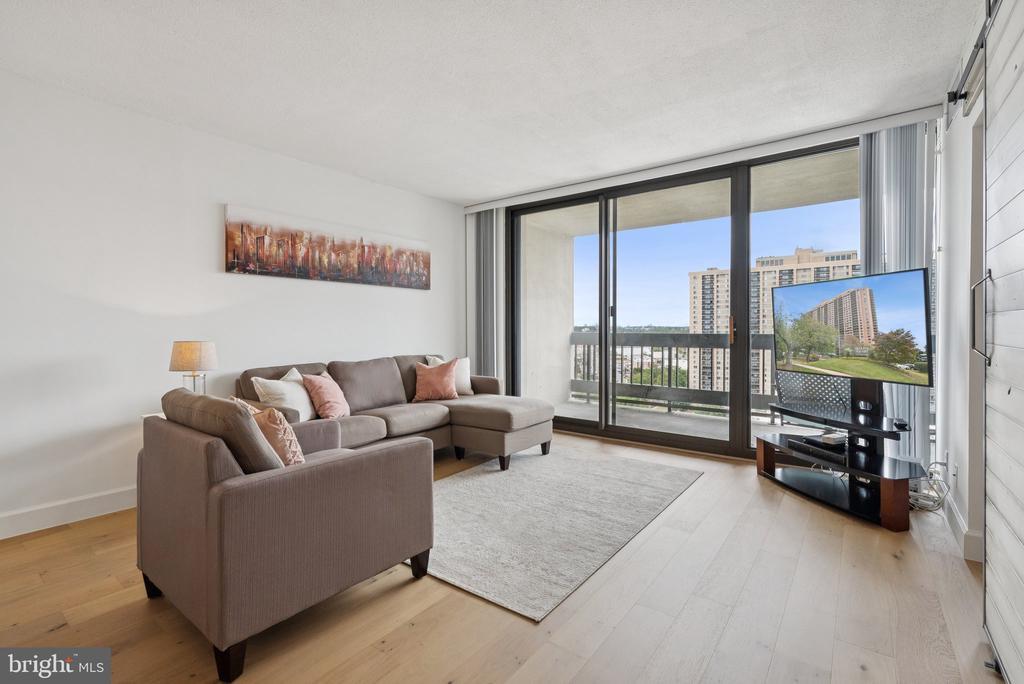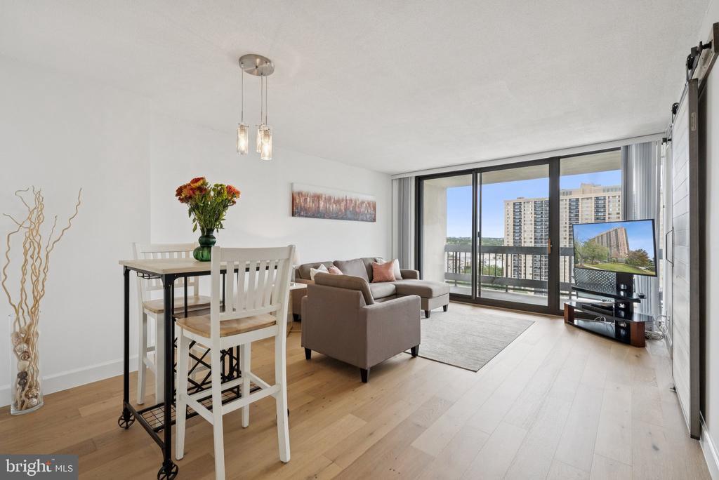 Experience modern living at its finest in this beautifully remodeled 16th-floor high-rise unit featuring breathtaking sunset views. This light-filled home showcases brand-new appliances, quartz countertops, new LVP flooring, and fresh paint throughout. Floor-to-ceiling windows flood the space with natural light, while a stylish barn door adds a touch of charm and maximizes usable space. Enjoy the convenience of an assigned garage parking space and additional storage unit, along with an array of community amenities including a pool, fitness center, study/lounge area, and ample guest parking. Ideally located just 15 minutes from Washington, D.C. and with easy access to major highways, this residence perfectly combines comfort, style, and convenience.