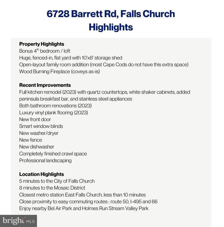 Fall in love with this beautifully updated 3 Bed, 2 Bath, Cape Cod featuring bonus 4th bedroom, open-layout family room addition, huge flat fenced-in backyard and modern sleek finishes throughout. *Open House This Saturday*. With a refreshing, bright, airy aesthetic, this home is completely renovated from top to bottom and has been meticulously maintained. All of this in a quiet, residential neighborhood 5 minutes to countless shops and restaurants and situated for easy commuting routes. Welcome to the cutest house on the block! Open Houses this weekend! *What makes this home stand out?* An exceptional floor plan that includes a front living room with white brick fireplace, leading to the spacious kitchen and open-layout dining and family room. The huge addition at the back of the home is walled with windows to allow ample natural light and flows seamlessly into the backyard. The first floor boasts two bedrooms, the second bedroom can function as a bedroom, nursery, office, or closet extension off the primary. The second floor features one bedroom, one full bathroom and a bonus loft room perfect for an office, playroom or guest room. One of the most exciting features of this property is the 7,200 sqft lot with a massive, flat, fenced in yard with spacious storage shed and new fence. This is truly an oasis that you can make into your own outdoor paradise, whether its for your garden, kids, pets, or entertaining with family and friends this backyard is a dream come true. (Recently seeded, new grass coming soon!) *Valuable Improvements* Full kitchen remodel (2023) with quartz countertops, white shaker cabinets, added peninsula breakfast bar, and stainless steel appliances, both bathroom renovations and luxury vinyl plank flooring (2023), new front door, smart window blinds, new washer/dryer, new dishwasher, completely finished crawl space and professionally landscaped. *What makes this location stand out?* Quick 5 minutes to the City of Falls Church, 8 minutes to the Mosaic District, 12 minutes to Ballston and situated perfectly for easy commuting routes. Close proximity to the East Falls Church Metro, route 50, I-495 and 66, Enjoy nearby attractions including Bel Air Park and Holmes Run Stream Valley Park. *Open Houses This Weekend Saturday 11/1 from 12pm-2pm, stop by to see this gem in person!*