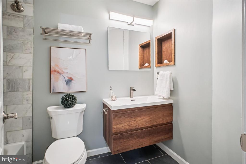 Fall in love this season with this spectacular three-level, brick front, garage townhouse in the sought-after neighborhood of Shadowbrook. This Franklin design former model home has been thoroughly updated and renovated for its new owners. Renovations include all four bathrooms with stylish floating vanities, modern fixtures, chic tile showers and floors, and modern lighting. Entering the home, you will be welcomed into a warm foyer designed with upgraded lighting, large coat closet, and Pergo laminate flooring that flows seamlessly through the entire main level of the home. Step up to the beautiful Sun-drenched eat-in kitchen with stainless steel appliances, new sink, fixtures, and disposal. Step over to the Pella Bay window and start the day in your cozy breakfast nook. As you leave the kitchen, notice the fully renovated half bath with stylish vanity and modern fixtures. Entering the dining room, you will notice spotless laminate floors, upgraded chair rail and crown molding, 9’ ceilings, in addition to gorgeous columns separating the dining area from the family room. Imagine gathering in your large family room adorned with laminate floors, crown molding, gorgeous arched Pella windows, and sliding wood doors. Everyone will enjoy gathering around the gas-log fireplace during those chilly winter nights. After a stressful day, open that sliding wood door and enter into your own peaceful outdoor paradise comprising a beautiful flagstone stone patio, professional landscaping, mature trees, and built in Koi Pond. Imagine doing a Yoga workout or connecting with friends and family in your own private Zen Garden. As you retreat for the night, make your way up the steps with plush Berber carpet to the second level. Here you will find the Sun-lit freshly painted primary bedroom, with cathedral ceiling, chair rail molding, ceiling fan, and large walk-in closet with access to attic storage. Enjoy the en-suite fully renovated primary bathroom designed with a floating dual vanity with modern fixtures, tile floors, custom built in, and beautiful stand-up shower. As you make your way through the rest of the second floor, you will find a second fully renovated bathroom decked out with a floating vanity, custom built in, and gorgeous marble tile. Two additional bedrooms close out the second level with large closets and ceiling fans. The lower level features a huge flex space room (rec room, office, playroom) with wood burning fireplace, a third fully renovated bathroom with floating vanity and stylish tile, laundry area, utilities, and a large one car garage. The concrete driveway can accommodate two additional cars. Nature lovers will enjoy access to the Pohick Creek Trail, on site playgrounds, and tennis court with pickleball. Commuters have quick and easy access to Ft. Belvoir, the Franconia Springfield Metro station, Virginia Railway Express, and interstate 95. Easy access to great dining and shopping at the Springfield Town Center. This Springfield townhouse located in the desirable Shadowbrook neighborhood checks all the boxes. Schedule your private showing today.