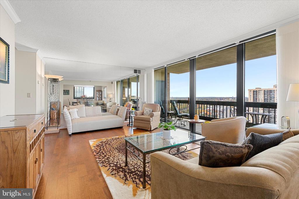 Welcome to an exquisite 22nd-floor residence in Skyline Square, where breathtaking panoramic views of the DC skyline—featuring iconic landmarks like the US Capitol, Washington Monument, and Old Town Masonic Temple—merge seamlessly with sophisticated living. This fully renovated, move-in-ready home radiates elegance with floor-to-ceiling windows flooding the living room with natural light, enhanced by energy-efficient, remote-controlled Hunter Douglas shades that create a cozy, festive ambiance perfect for holiday celebrations. The gourmet kitchen showcases solid cherry oak cabinets, sleek granite countertops, a matching backsplash, and SS kitchen appliances, complemented by ‘Santos Mahogany’ hardwood floors, a white marble foyer, and rich hardwood in the living and dining areas, all accentuated by the neutral “Alpaca” paint by Sherwin Williams. Two spa-inspired, fully remodeled bathrooms with modern showers and a double vanity in the primary suite elevate daily luxury, while a full-size washer and dryer in a dedicated laundry room ensure convenience. Enjoy exclusive amenities, including two dedicated garage spaces—a rare treasure—and access to the community’s EV charging station, nestled in Northern Virginia’s vibrant Bailey’s Crossroads, developed by Charles E. Smith in the 1970s. With seamless access to BRAC, Pentagon City, Amazon HQ2, Old Town Alexandria, downtown DC, I-395, I-495, and Reagan National Airport, this home delivers a luxurious, low-maintenance lifestyle, ready for you to embrace the holidays in unparalleled style!