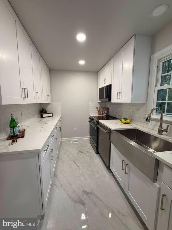 Beautifully renovated and professionally staged corner-lot townhome in sought-after Newington Forest! This move-in-ready 3-level home offers 1,920 sq ft of modern living with over $50K in upgrades. (Public records show 1,320 sq ft above grade plus an additional 600 sq ft of beautifully finished basement space offering flexible options for a rec room, office, gym, or guest suite.) Features include a brand new designer kitchen with quartz countertops, stylish backsplash, and premium LG stainless steel appliances. The main level boasts Brazilian cherry hardwood floors, fresh paint throughout, and a brand-new half bathroom for added convenience. The fully finished walkout basement includes new flooring, a brand-new full bathroom, and a flex room that can serve as a home office or 4th bedroom (non-egress). Also equipped with new LG washer, dryer, and water heater. Enjoy outdoor living on the expansive Trex deck overlooking open green space. Conveniently located near Fairfax County Parkway, I-95, Springfield Metro (approx. 4.5 miles), and shopping. Zoned for top-rated schools: Hunt Valley Elementary, Irving Middle, and West Springfield High. Two assigned parking spaces included. This turnkey home combines comfort, quality, and location—schedule your showing today!