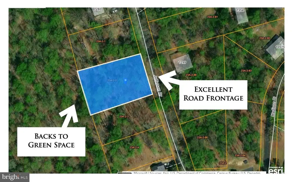 BUILD YOUR DREAM HOME IN PRESIDENTIAL LAKES! Large, private, buildable lot in the desirable Presidential Lakes community! Walking distance to multiple lakes, playground, ball courts, and more! Easy access to Kings Highway, Rt 301, I-95, and county schools! Check out the expansive green space on the back western line, plus the generous road frontage. Undeveloped lots on either side offer additional privacy. This elegant, well established neighborhood is conveniently located in central King George county, and boasts multiple bodies of water, with over-lake pavilion, beach, playgrounds, ball courts, and more! Bring your builder of choice and design the custom home of your dreams on Jefferson Drive today! When planning your site visit: Please use GPS to navigate to a nearby address - 7299 Jefferson Dr, King George, VA 22485, which is across the street from the subject parcel.