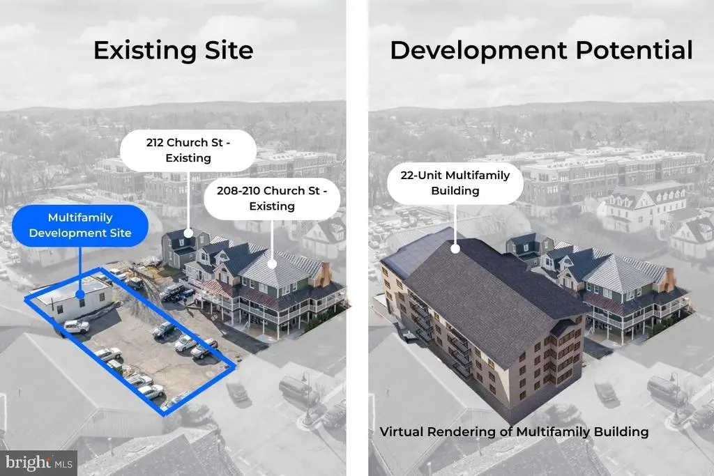 Downtown Leesburg Multifamily Development Opportunity Approved for 22 Units | Existing Income-Producing Retail | Prime Infill Site Positioned in the heart of historic downtown Leesburg, this rare multifamily development opportunity offers a blend of immediate cash flow and long-term value. The property currently features two fully-leased retail buildings totaling 11,466 SF, generating a gross annual income of $279,778. The site is approved for a new 4-story, 22-unit multifamily building with a maximum height of 65 feet and a total building square footage of approximately 25,000 SF. Each residential unit is planned at an ideal size of approximately 1,495 SF, catering to the demand for spacious, high-end living in one of Northern Virginia’s most desirable downtown settings. Highlights Prime Downtown Leesburg Location: Situated in the heart of historic Leesburg, this infill site offers excellent visibility, walkability, and access to the area’s top amenities including shops, dining, and entertainment. Income-Producing Retail: Two fully leased retail buildings totaling 11,466 SF (212 Church: 2,102 SF | 208–210 Church: 9,364 SF) generate $279,778 in gross annual income, providing strong interim cash flow. Approved Development Plan: The site is fully approved for a 22-unit multifamily building with a maximum height of 65 feet and four levels—eliminating entitlement risk and accelerating your development timeline. Spacious Residential Design: Each unit is planned at approximately 1,495 SF, ideal for upscale rentals or boutique condominium product targeting professionals and affluent downsizers. Attractive Investment Profile: Rare opportunity to acquire a shovel-ready, mixed-use site in one of Northern Virginia’s fastest-growing and wealthiest counties—ideal for build-to-hold or build-to-sell strategies. Strong Market Fundamentals: Leesburg’s high-income demographics, limited multifamily inventory, and growing demand for walkable residential product support long-term value and rent growth potential.