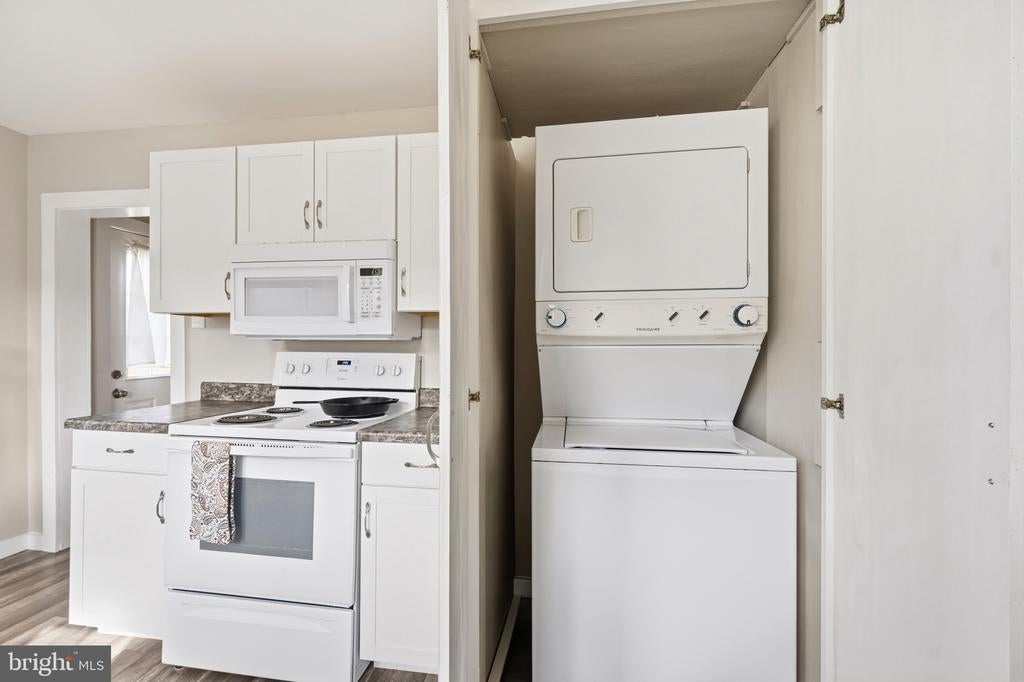 Dryer - Electric, Oven/Range-Electric, Range hood, Refrigerator, Washer/Dryer Stacked