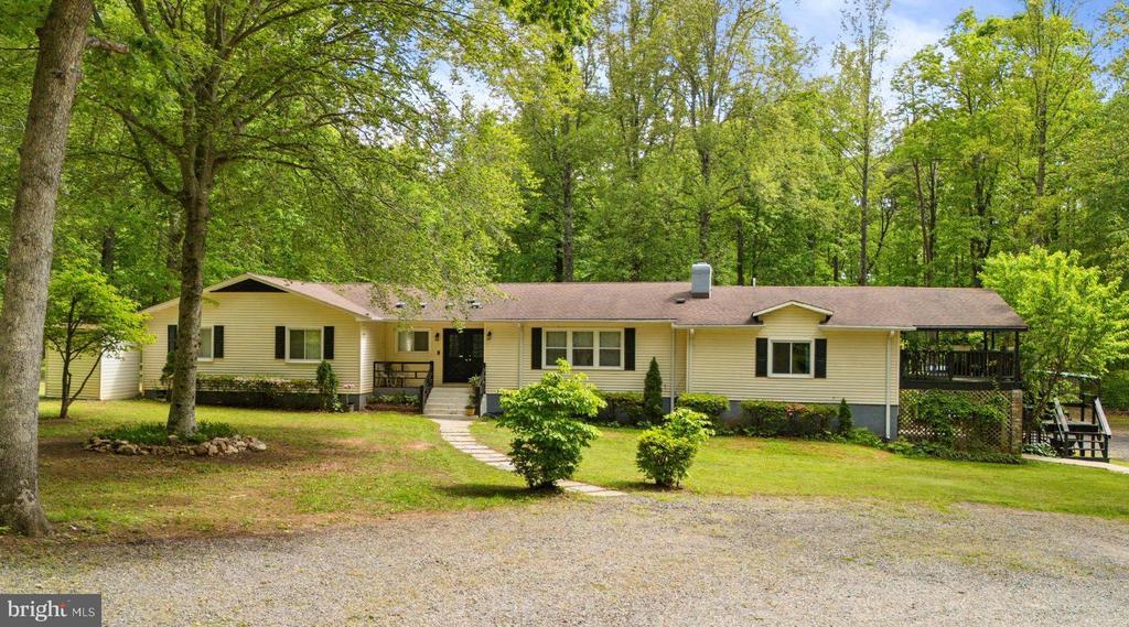 Welcome home to 141 Meadows Rd, your private flat 5 acre oasis! Large sprawling 5 bedroom 3.5 bath rambler with separate in-law suite space or potential for separate rental! This lovely home is nestled in the heart of Stafford County's horse country, yet only a few minutes drive to Route 17 with easy commutes to Fredericksburg, Quantico, Warrenton, Culpeper, Manassas, Woodbridge etc. Start your homestead on this gorgeous, picturesque parcel of land. No HOA! Plenty of space for several large gardens, room for chickens, goats, horses and other farm animals. Horses reside next door. The house has plenty of room for a large family with 4 bedrooms on the main level and 3.5 bathrooms, all freshly renovated in 2024! The lower level has an additional 5th bedroom and recreation room that exits to a covered patio. Large eat in country kitchen with additional Dining Room/Sunroom that connects to a second kitchenette/party room. The second kitchenette/party room exits with sliding doors to the covered side porch. There are two primary bedrooms with ensuite bathrooms at either ends of the house, making it easy to accommodate a multiple generation family or create an income producing rental on the right wing of the house! Separate In law suite or one bedroom apartment potential! The well maintained and outdoor space has endless opportunities. There are fruit trees growing in the back yard. There are 2 sheds and a detached carport. The horseshoe driveway has parking space for the whole family, plus room for boats, RV's, work trucks, and all the toys. Recent upgrades include new bathrooms with gorgeous marble vein ceramic tile on walls and floors, new tubs, toilets, vanities & fixtures. New luxury vinyl plank flooring on two levels, new carpet in 3 bedrooms, and roof was just replaced, October 2025! Windows are newer double hung, double insulated vinyl clad. Lovely, covered porch and patio (2 tier) for entertaining as well as concrete patios in the back yard. Shed/garage and carport for additional storage. Seller occupied, no rent back needed. Please schedule showings online. Comcast Xfinity high speed internet and cable. New Roof October 2025! Roads in the community have been approved by Stafford County to be paved and county maintained! No Thru Neighborhood! Rural while being 15 minutes from shopping and Restaurants at Virginia's Southern Gateway area of Fredericksburg.