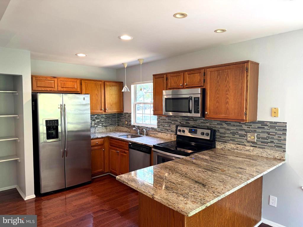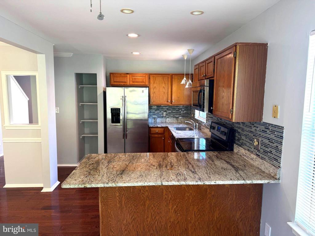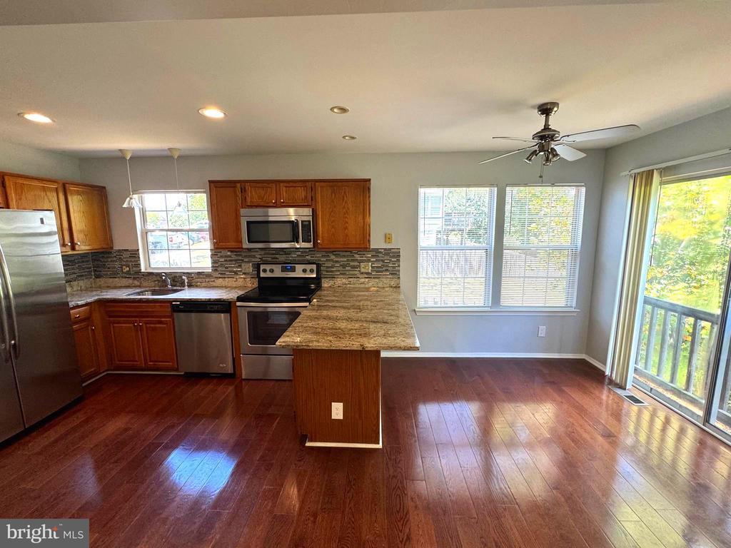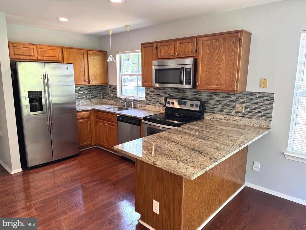 Welcome to this stunning 3 bedroom, 2.5 bath end-unit townhome featuring modern updates and plenty of space for comfortable living. Step inside to find gleaming hardwood floors flowing throughout the main and upper levels, complemented by recessed lighting that adds a warm, contemporary touch. The kitchen boasts granite countertops, stainless steel appliances, and a cozy breakfast nook, perfect for morning coffee. A separate dining area makes entertaining easy and enjoyable. The finished basement offers versatility with elegant porcelain tile flooring, a fireplace, and direct access to a large fenced in backyard overlooking wooded trees, ideal for gatherings, pets, and outdoor relaxation. Additional features include 2 assigned parking spaces and a convenient location just minutes from I-95, shopping, dining, and major retailers including Home Depot, Lowe's, Ross, and more. This home combines style, comfort, and convenience-schedule your showing today!