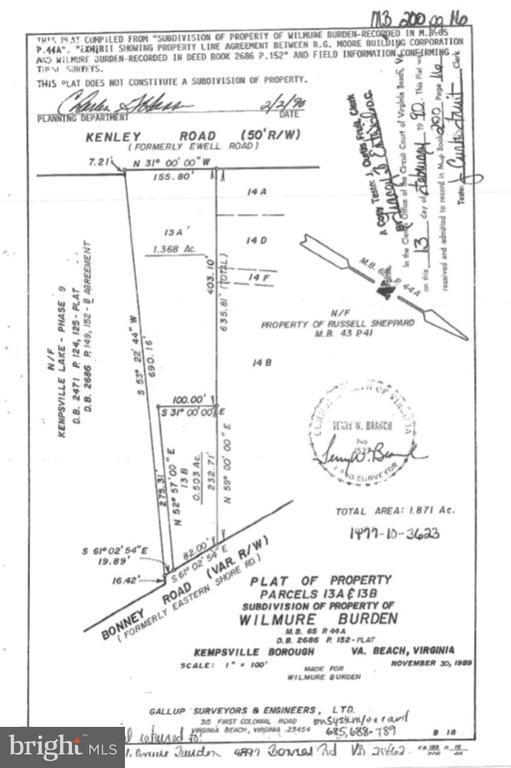 This amazing opportunity of two parcels being sold together, as they collectively offer a total of +/- 2 acres of land in Virginia Beach. The property survey has been included in the attachment for your convenience. It provides detailed information regarding the property, boundaries, measurements, and features! 13A Kenley Road, the second parcel, can be accessed from both the front and back, ensuring that both residents and guests have simple entry and exit. The property survey, conducted in February 1990, has been included and attached for your convenience. It provides detailed information regarding the property's boundaries, measurements, or features.