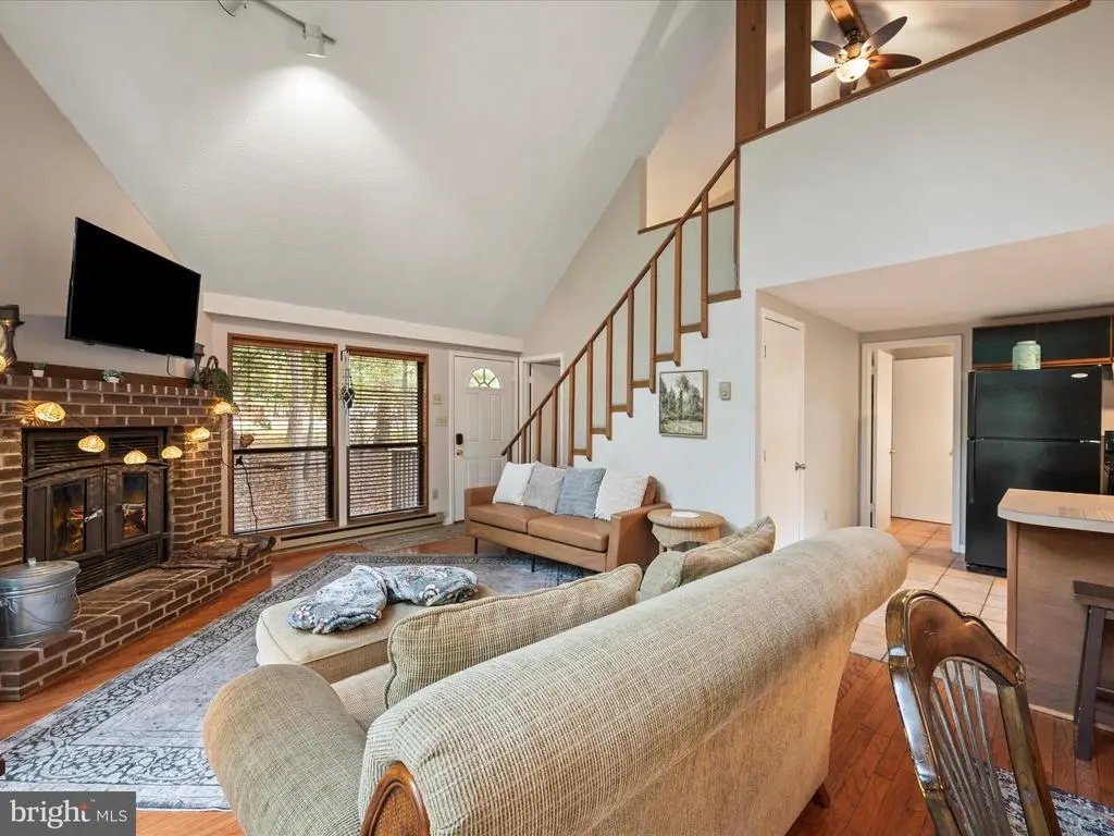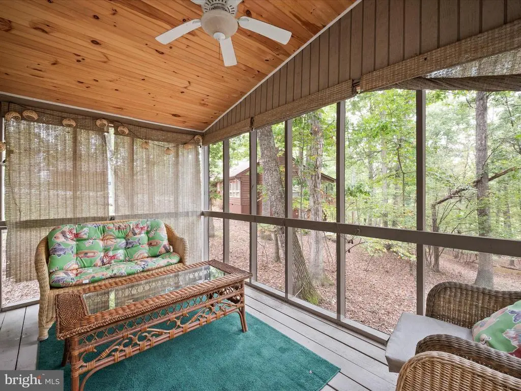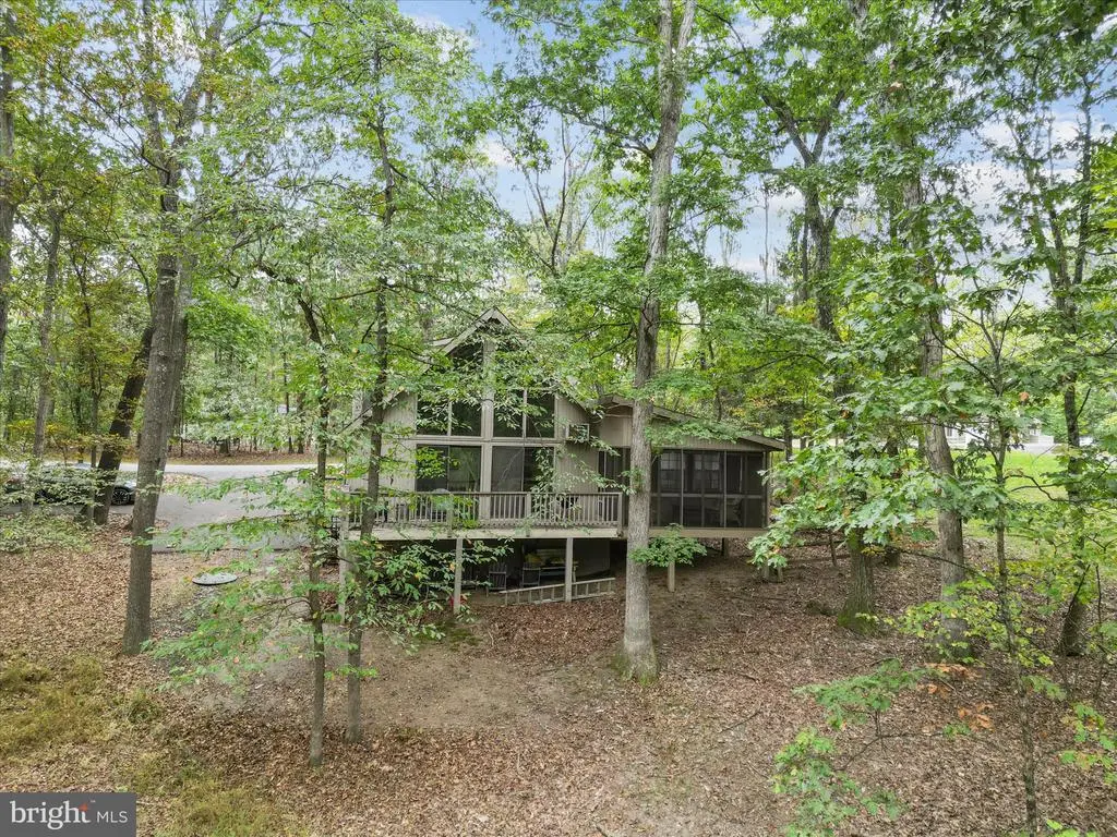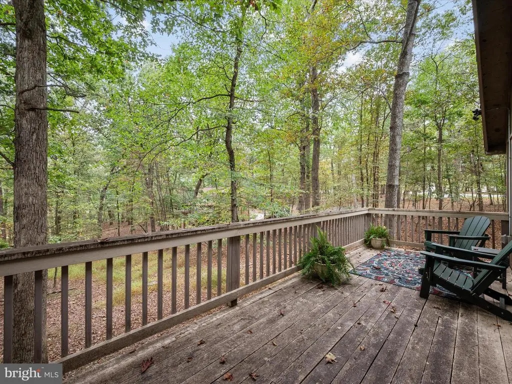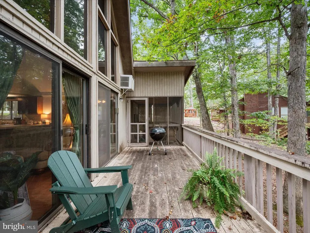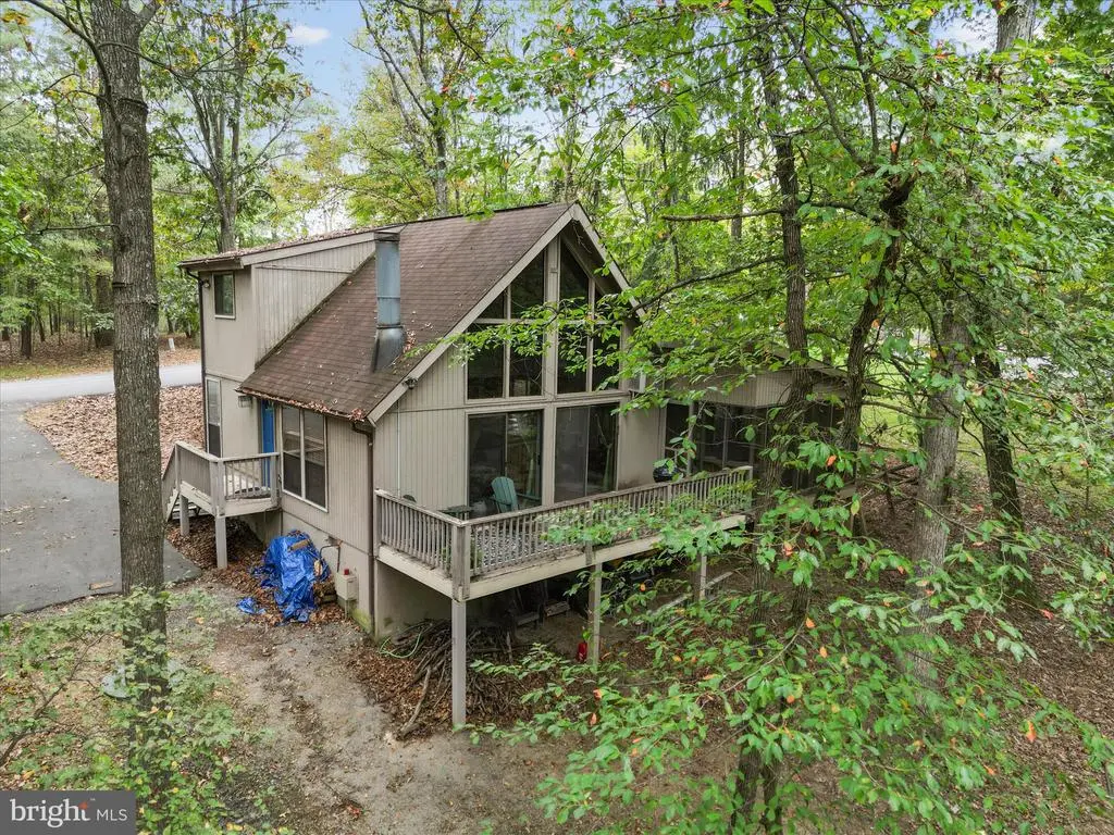 Welcome to this charming 2-bedroom, 2-bath cabin nestled in The Woods resort community. The main level features a comfortable bedroom and full bath, along with an inviting open layout that connects the kitchen, dining area, and living room. Soaring two-story A-frame windows and a wood-burning fireplace create a warm and welcoming focal point, while double sliding glass doors lead directly to the deck for seamless indoor-outdoor living. Just off the kitchen, a sun-filled bonus room with walls of windows and two skylights. Use it as a guest room, home office, or playroom; the possibilities are endless. From here, step out to the screened porch for bug-free outdoor enjoyment, or continue onto the adjoining deck that overlooks the peaceful wooded surroundings. Upstairs, the loft-style primary suite includes a private bathroom with a skylight that fills the space with natural light and tree-top views. Life at The Woods offers year-round recreation all within 90 minutes of Washington, D.C. With a Class B membership available for an additional initiation fee, you can enjoy private club amenities including tennis, pickleball, indoor and outdoor pools, a full fitness center, racquetball, and more. The community also features a clubhouse, pub and grille, spa and salon, playgrounds, fishing ponds, and easy access to Sleepy Creek Wildlife Management Area for hiking, hunting, and outdoor adventure. Whether you’re looking for a full-time residence or a weekend retreat, this cabin pairs the serenity of a wooded escape with the lifestyle and amenities of a vibrant resort community.