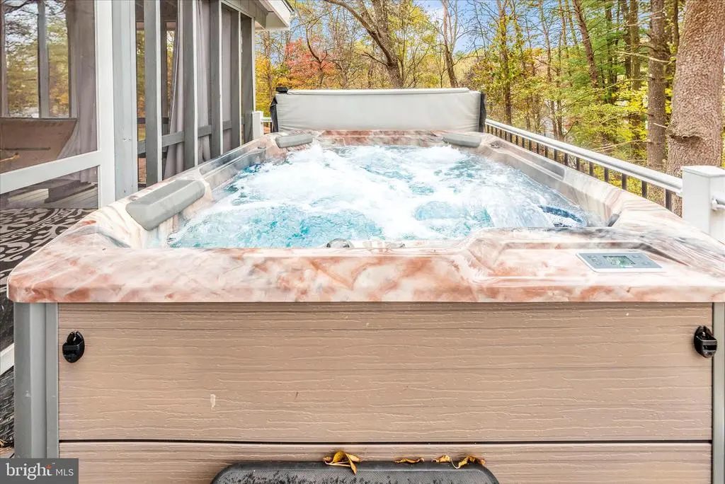 BBQ Grill,Exterior Lighting,Gutter System,Hot Tub,Deck(s),Patio(s),Porch(es),Roof,Screened