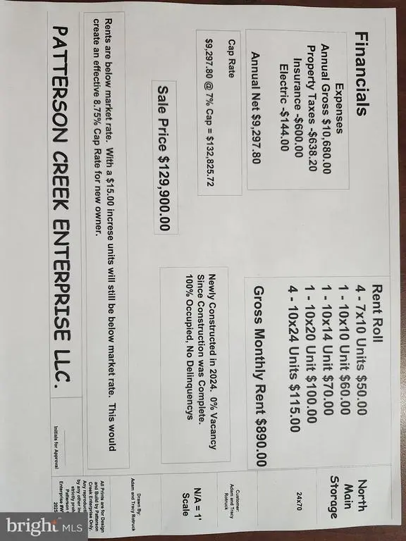 PRICE REDUCTION! LOOKING FOR A SELF OPERATING BUSINESS THAT PAYS FOR ITSELF IN NO TIME AT ALL! IT DOESN'T GET MUCH BETTER THAN THIS! TURN KEY SELF-STORAGE OPERATION, ALL THE WORK HAS BEEN DONE FOR YOU! NEWLY CONSTRUCTED SELF-STORAGE BUILDING WITH 11 TOTAL UNITS, 100% OCCUPANCY SINCE COMPLETION OF CONSTRUCTION! THIS SELF OPERATING BUSINESS IS CONVENIENTLY LOCATED ON N. MAIN ST IN KEYSER, WV. THIS IS A MAINTENANCE FREE MONEY MAKER (4) 7X10, (1) 10X10, (1) 10X14, (1) 10X20, & (4) 10X24 UNITS GENERATING AN ANNUAL GROSS INCOME OF $10,680, WITH MINIMAL OPERATING EXPENSES. IF YOU ARE LOOKING FOR A REAL, SOLID RETURN ON YOUR INVESTMENT, THIS IS EXACTLY WHAT YOU HAVE BEEN LOOKING FOR! FINANCIAL INFO/RENT ROLL AND BUILDING MATERIAL SPEC SHEET HAVE BEEN INCLUDED IN THE LISTING!